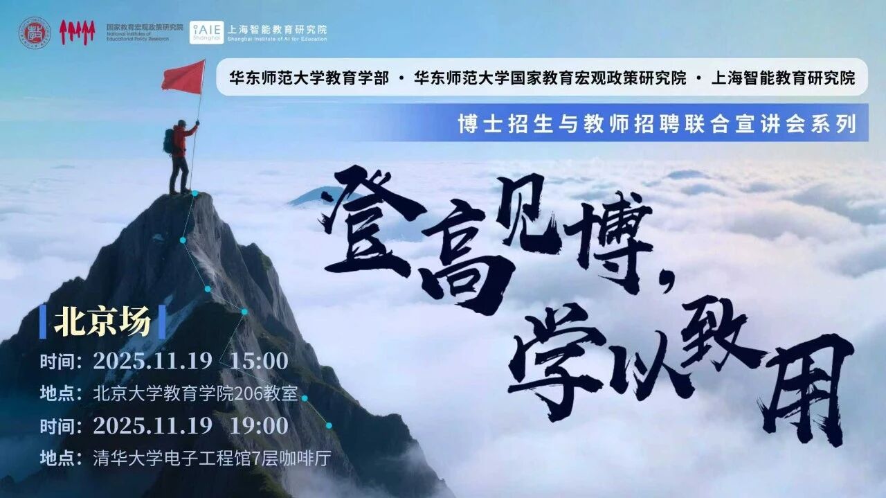 为汇聚英才,共筑智能教育未来,上海智能教育研究院携手华东师范大学教育学部、国家教育宏观政策研究院,将于2025年11月19日在北京举办博士招生与教师招聘联合宣讲会。活动分别设于北京大学与清华大学,诚邀对智能教育领域怀有志向的学者与学子参与交流。
